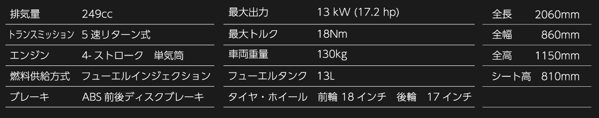 250cc単気筒エンジンは心地よい鼓動とマフラーサウンドで、軽い林道からワインディングロード、長距離ツーリングから、短距離移動もあらゆるシーンに最適です。